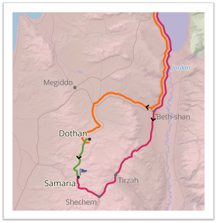 - 6.13, Dothan is 10 miles north of Samaria, located on a main route leading into the Jezreel valley.