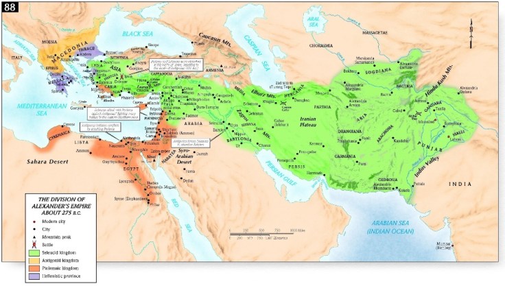 Cyrus was succeeded as ruler of the Persian empire by Cambyses, Smerdis, Darius and then Xerxes. These are the kings referenced in Daniel 11.2 and it was Xerxes who was arguably the riches of the Persian kings and the one who was most involved with battles against the Greeks. This verse spans about 70 years of Persian history. Then we skip ~130 years to the time of Alexander the Great who took the throne of Macedon in 336 B.C. (Daniel 11.3). Within 5 years he had toppled the Persian empire. However, Alexander died in 323 B.C. and a 20 year struggle for the throne ensued. Ultimately, Alexander’s descendants would not rule and the Greek empire was parceled out among his generals (Daniel 11.4; cf. 8.22). “Two of those divisions were in the Aegean region (Cassander had Greece and Macedonia; Lysimachus had Thrace), while the other two divided up the Near East (Ptolemy had Egypt and Palestine; Seleucus had Syria, Mesopotamia and Persia). The Ptolemaic line is going to represented by ‘the king of the South,’ while the Seleucid line will be represented by ‘the king of the North.’” (IVP Bible Background Commentary)