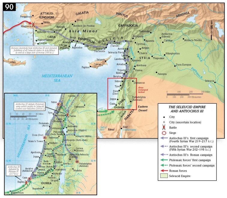 - Daniel 11.17-19 – While the message to Daniel concerned itself with events between Egypt and Syria (because Jerusalem lay between the two powers), other events were transpiring in the world that would shift the balance of global power. Rome had been encroaching on Greek territory and had established control of mainland Greece by 196 B.C. Some Greeks appealed to Antiochus for help and he was willing. But first, he needed to neutralize Egypt. He sought to do so by sending his daughter, Cleopatra, to be Ptolemy V’s bride. Antiochus had hoped that his daughter would spy for him, but instead she chose loyalty to her husband. Meanwhile, Antiochus suffered a string of defeats at the hands of the Romans who were under the command of Scipio. A much smaller Roman force soundly defeated the larger army of Antiochus at Magnesia (~ 50 miles north of Ephesus). Antiochus was forced to accept the Roman terms of surrender, including sending his son Antiochus IV to Rome as captive. “By the Treaty of Apmea in 189 Antiochus became a vassal of Rome, had to send twenty hostages to Rome, and paid a huge indemnity. This left him humiliated and short of funds… In 187 b.c. Antiochus and his followers were assassinated by the local people when he tried to plunder the treasury of the temple of Bel in Elymais in Persia in order to pay his tribute to Rome” (Zondervan Illustrated Bible Background Commentary)