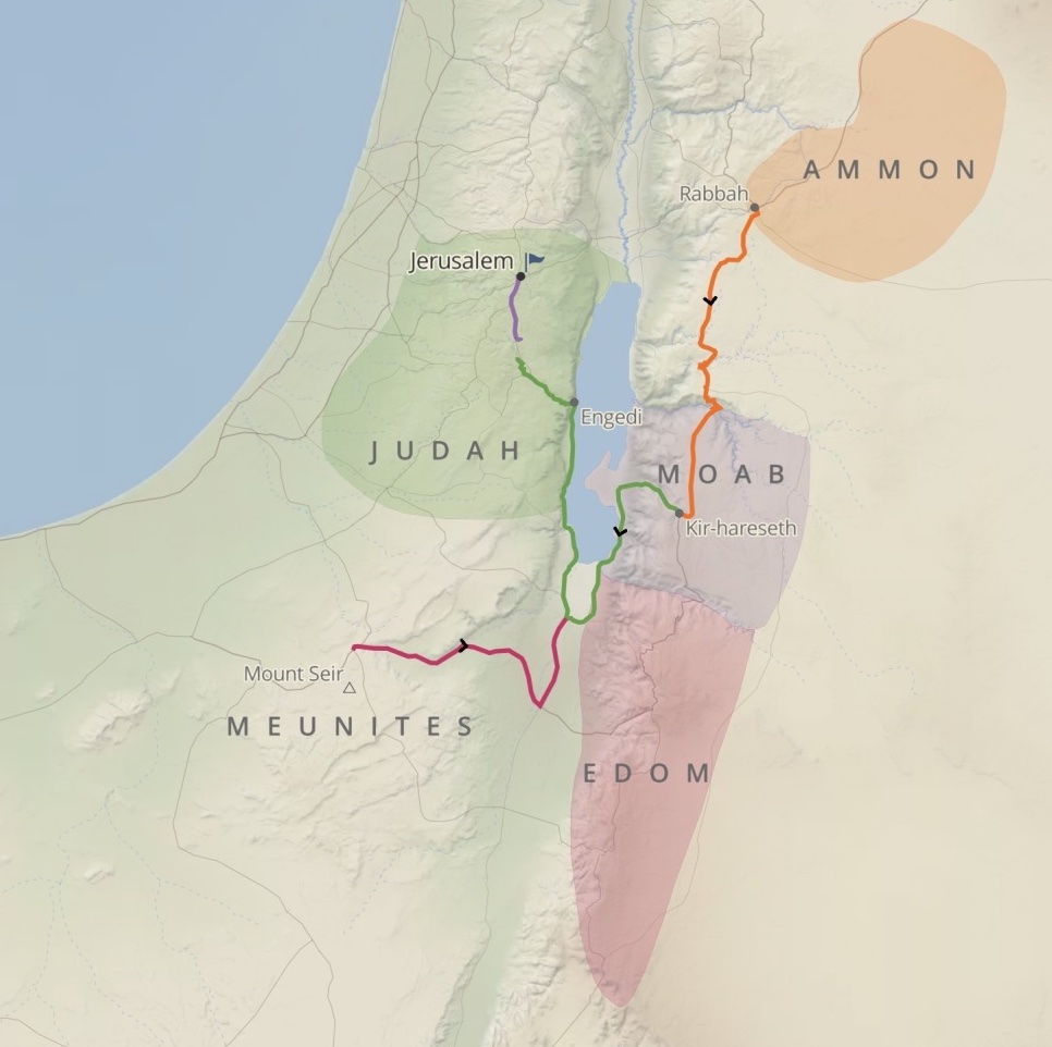 - Judah was invaded by the Moabites and Ammonites (2Chron. 20). The text does not say that this invasion was a result Jehoshaphat’s alliance with Ahab, but it’s a stark contrast to what was said earlier: “the dread of the Lord was on all the kingdoms of the lands which were around Judah” (2Chron. 17.10). It is likely that Israel’s defeat at the hands of the Arameans emboldened Moab and Ammon.